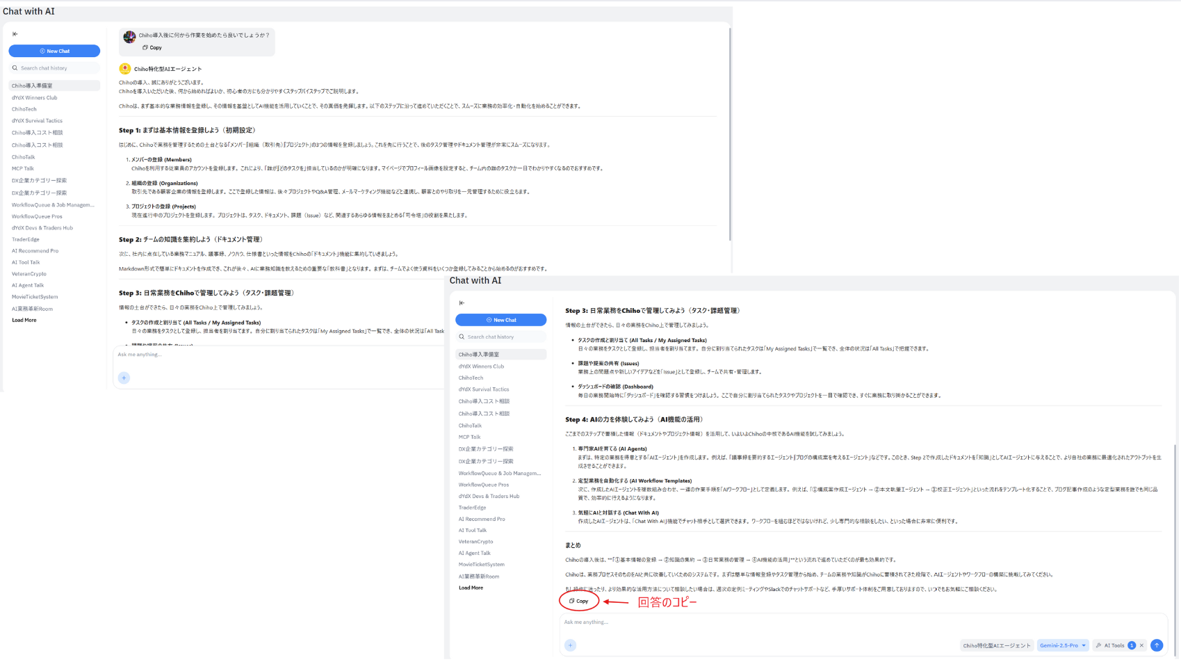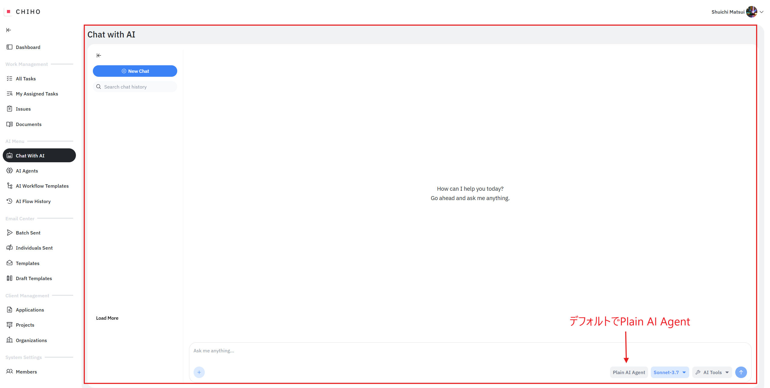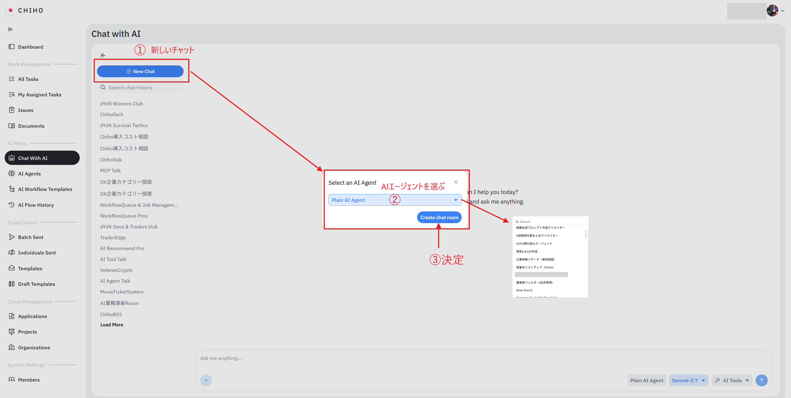 Chihoの「Chat with AI」機能は、様々な専門知識を持ったAIアシスタントと、目的に応じて対話できるチャットルームです。