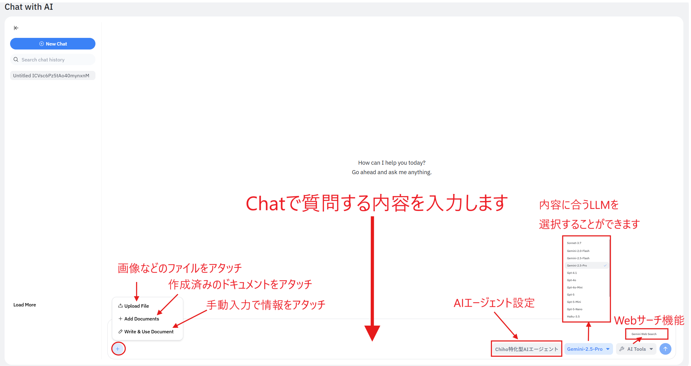 - LLMの選択: 質問内容に応じて、文章生成が得意なモデル、分析が得意なモデルなど、最適なAIモデル(LLM)を切り替えることができます。