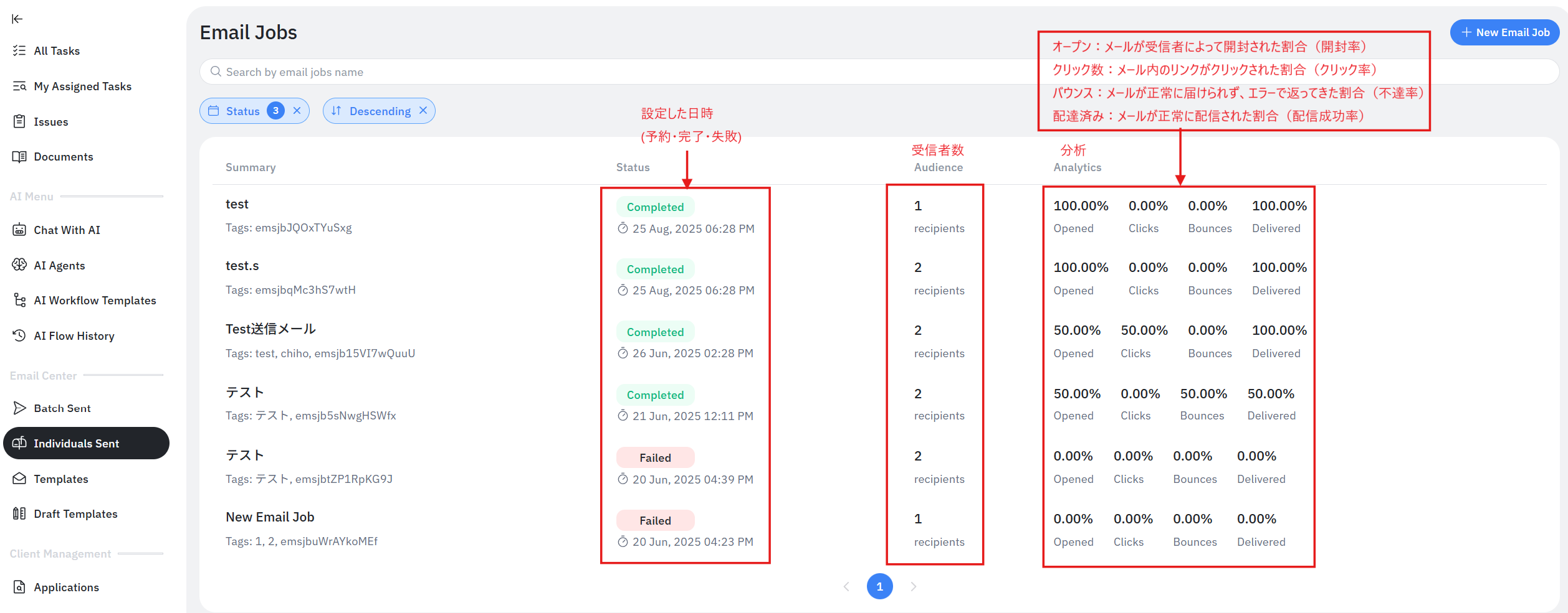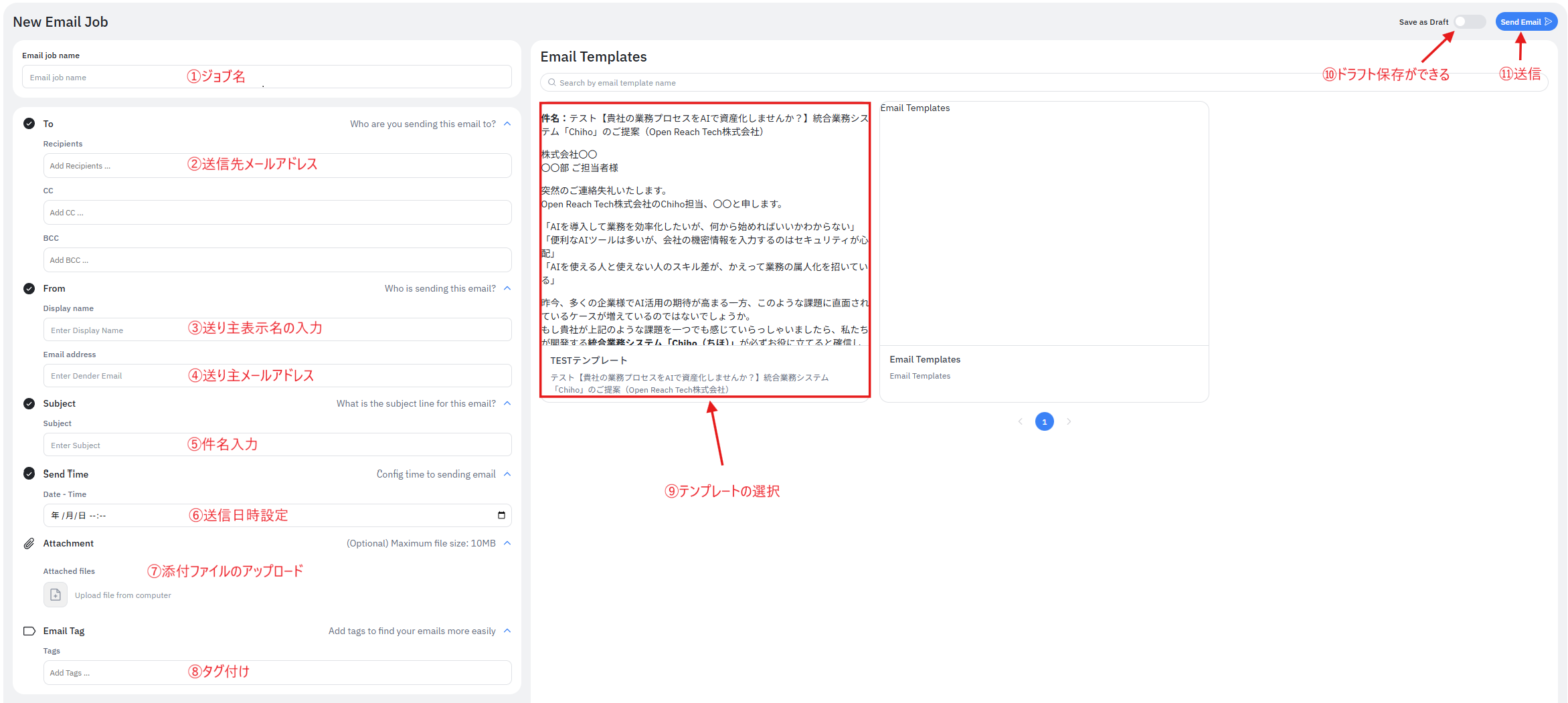 | 1 | Job Name | 管理用のジョブ名を入力します。(例:「A社B様への御礼メール」) |