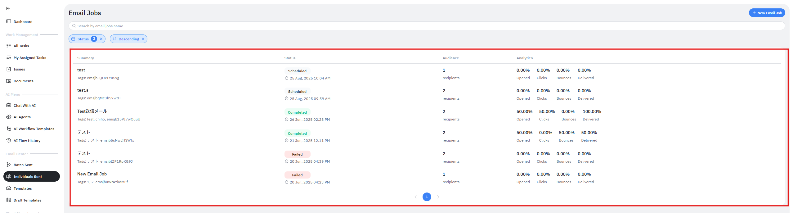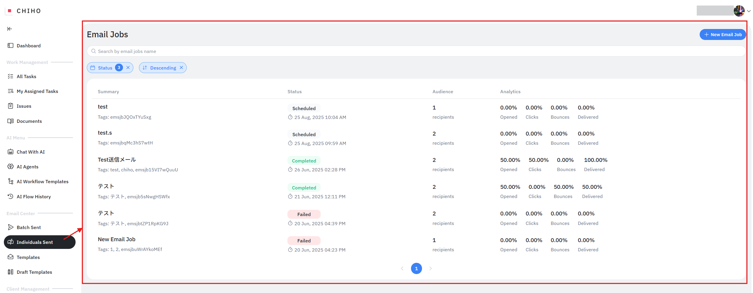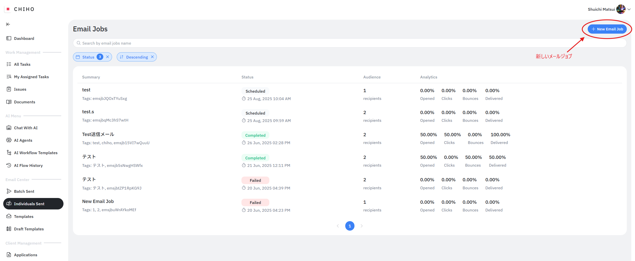画面右上の 「+New Email Job」 をクリックします。