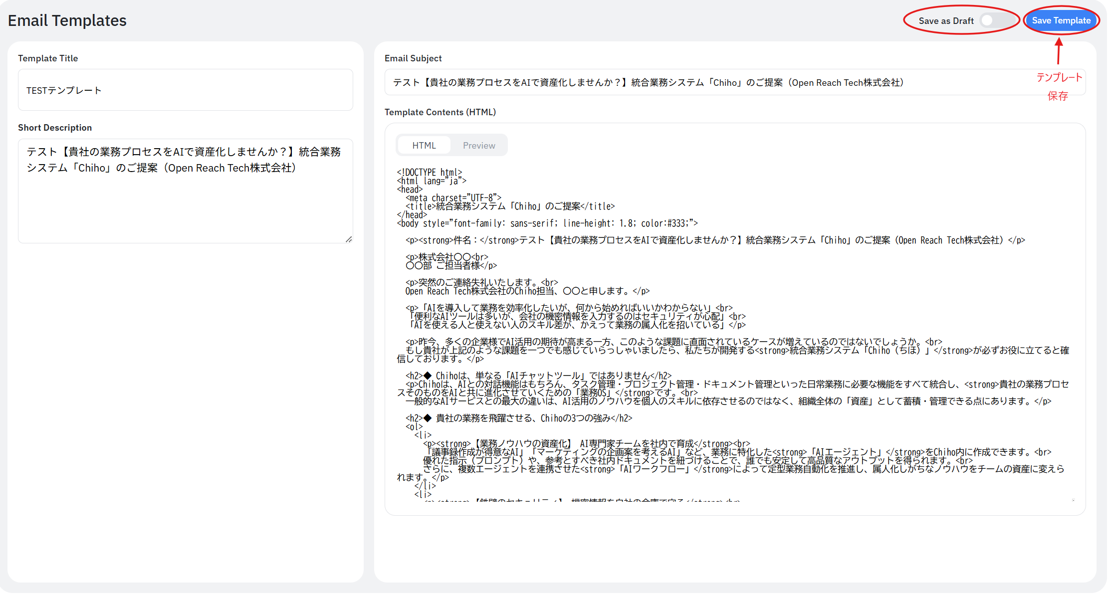 Chihoのメールマーケティング機能を最大限に活用するためには、まずこの「Email Templates」機能で質の高い雛形をいくつか用意しておくことが、成功への第一歩となります。