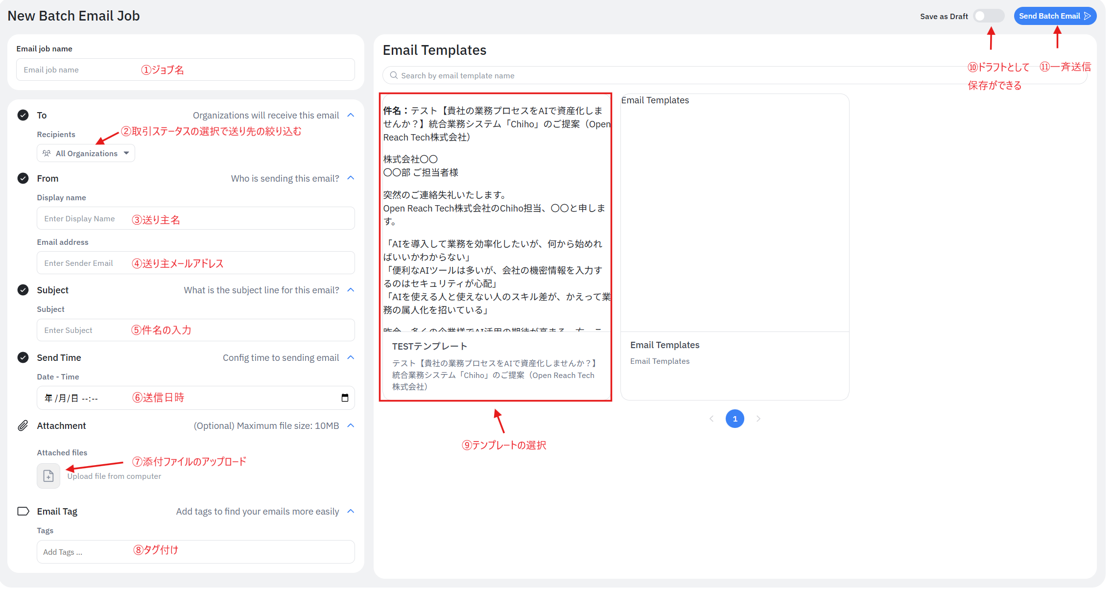 ここで作成したテンプレートは、「一括送信(Batch Sent)」や「個別送信(Individuals Sent)」の際に呼び出して使用します。