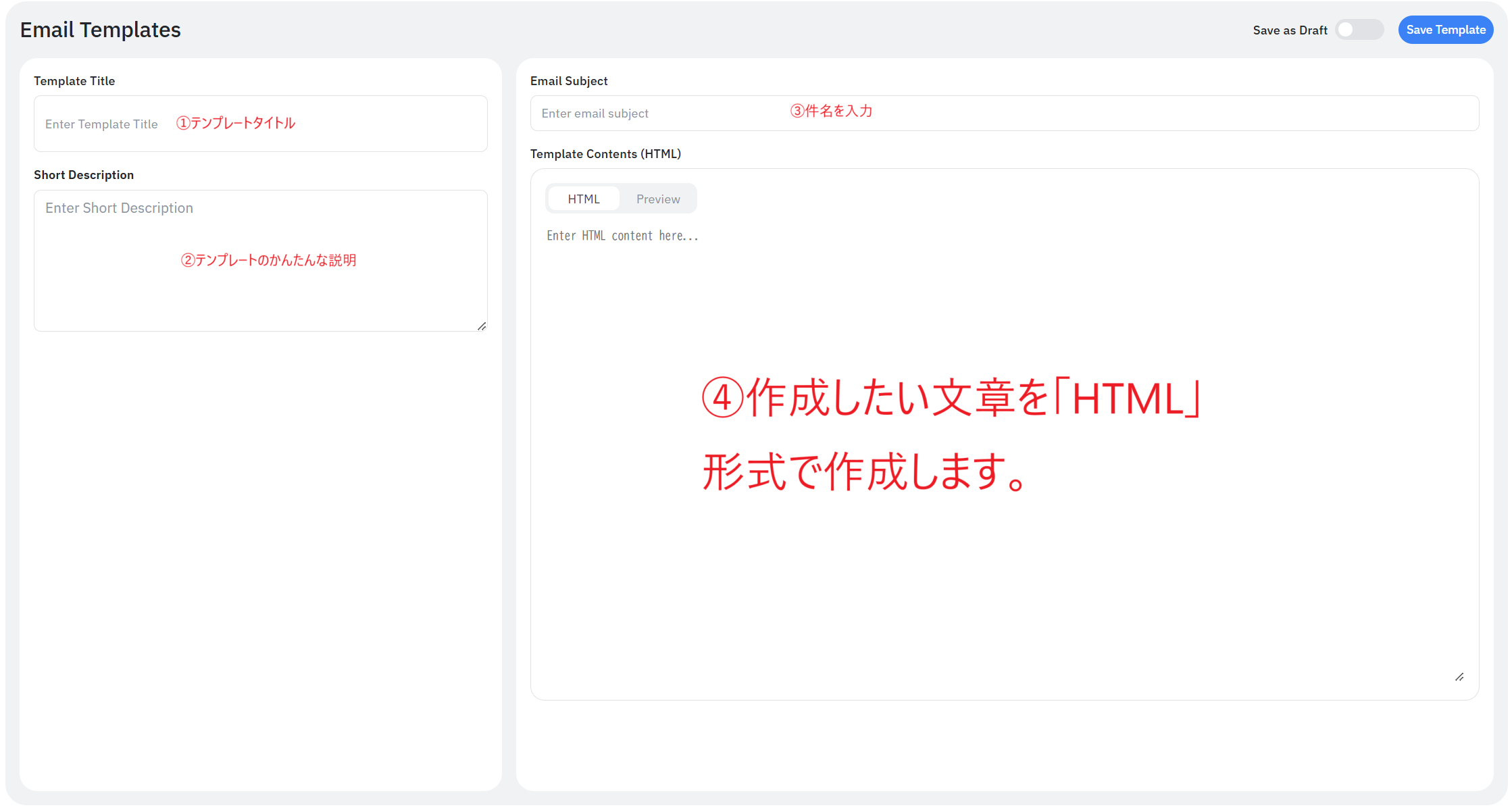 - Title: 管理用のテンプレート名を入力します。(例:「月次ニュースレター雛形」)