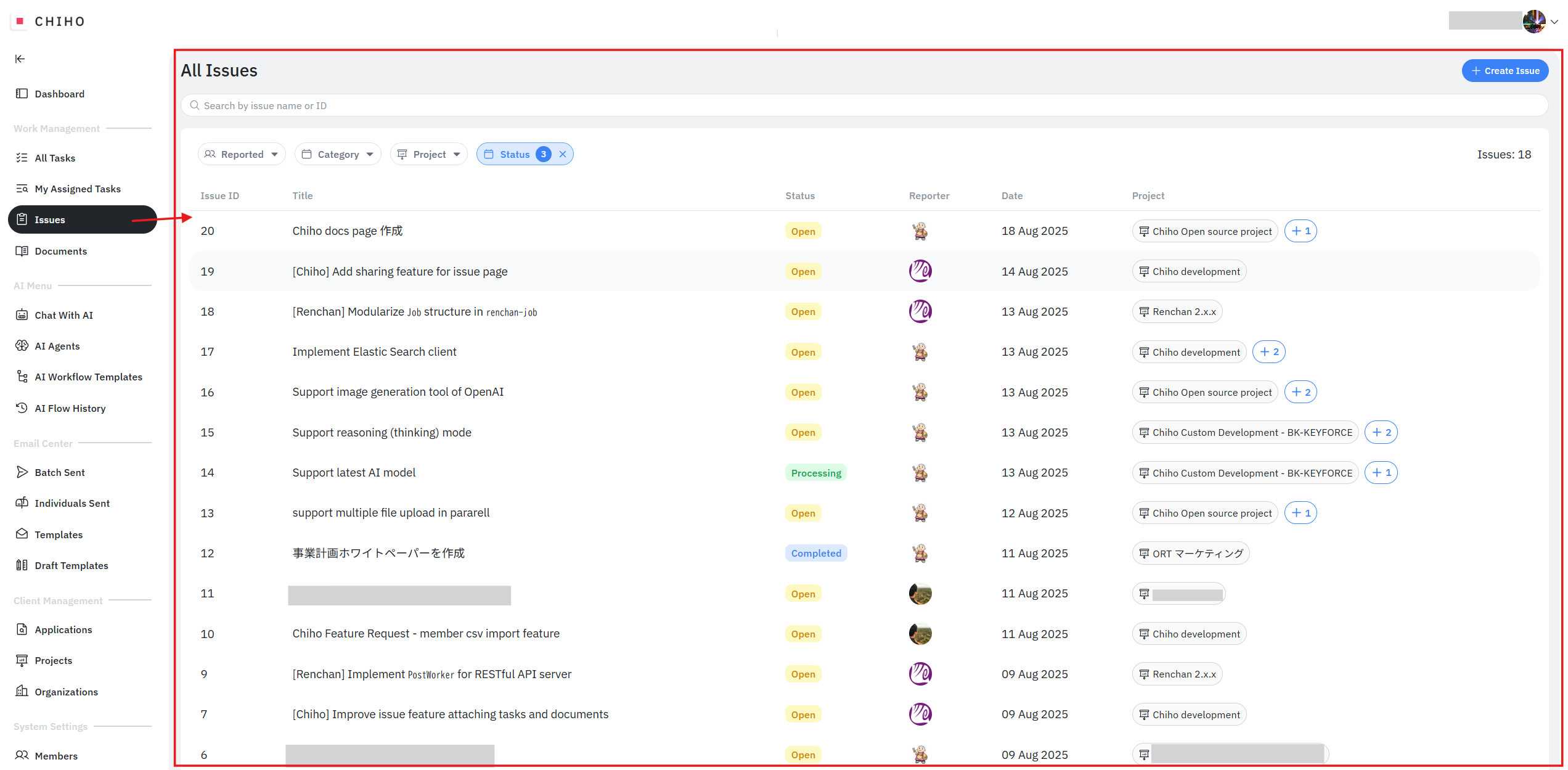 Chihoの「Issues」機能は、単なる問題報告ツールではありません。チーム内の課題や改善の種を拾い上げ、それらを公式な議題として管理し、解決へと導くためのコミュニケーションハブとして機能します。
