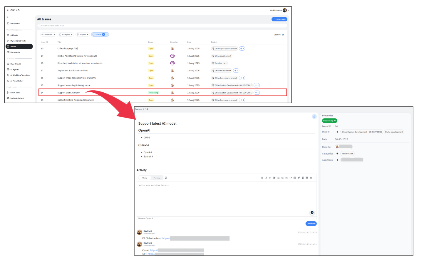 一覧から特定のIssue(例:「Support latest AI model」)を選択すると、詳細画面に移動します。