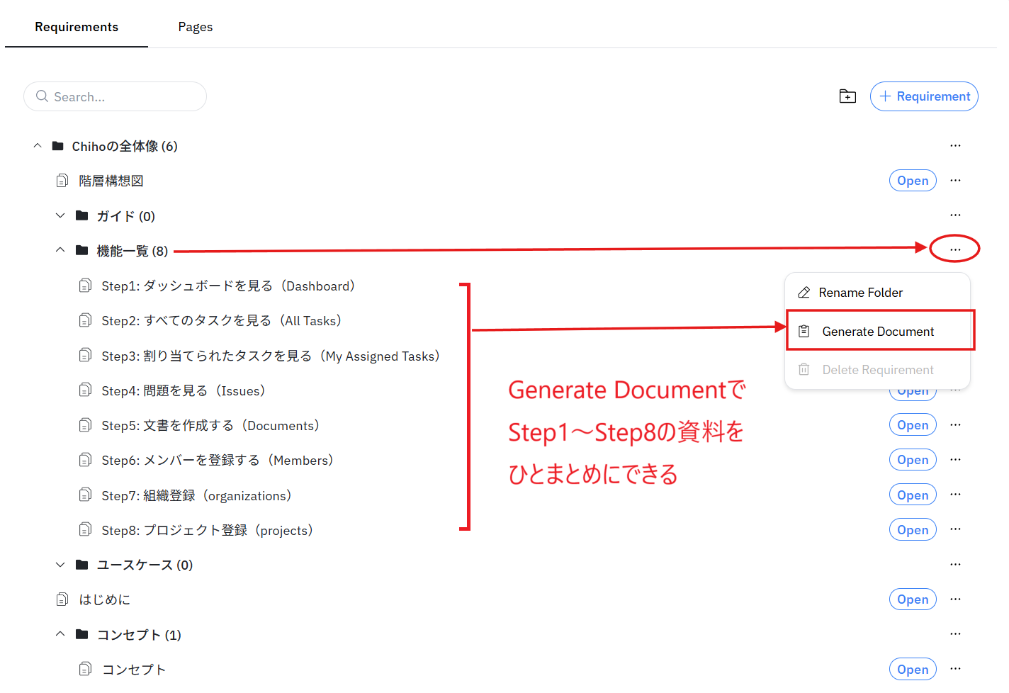まとめたいフォルダ(例:機能一覧)の右側にある「・・・」メニューをクリックし、「Generate Document」 を選択します。