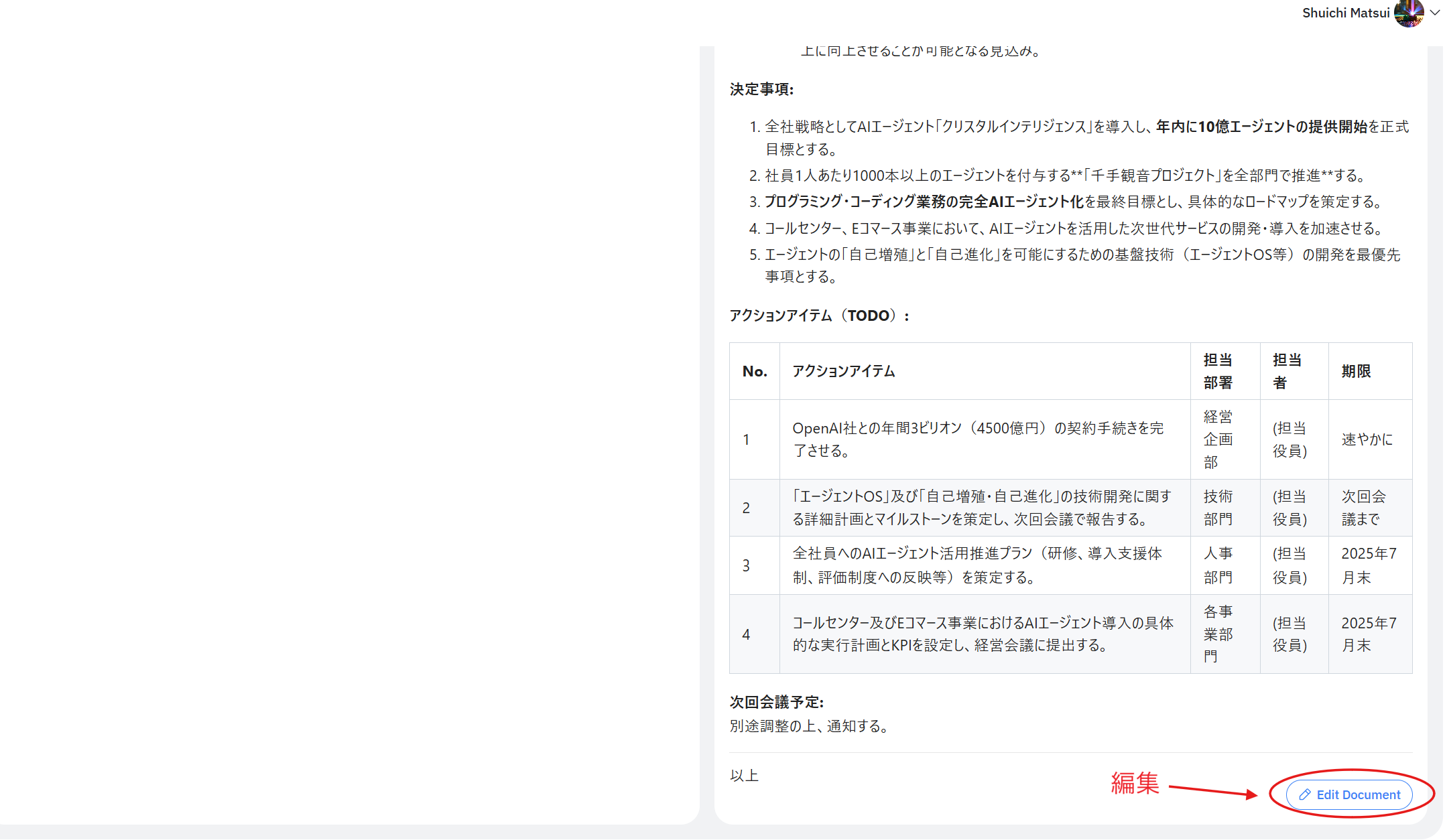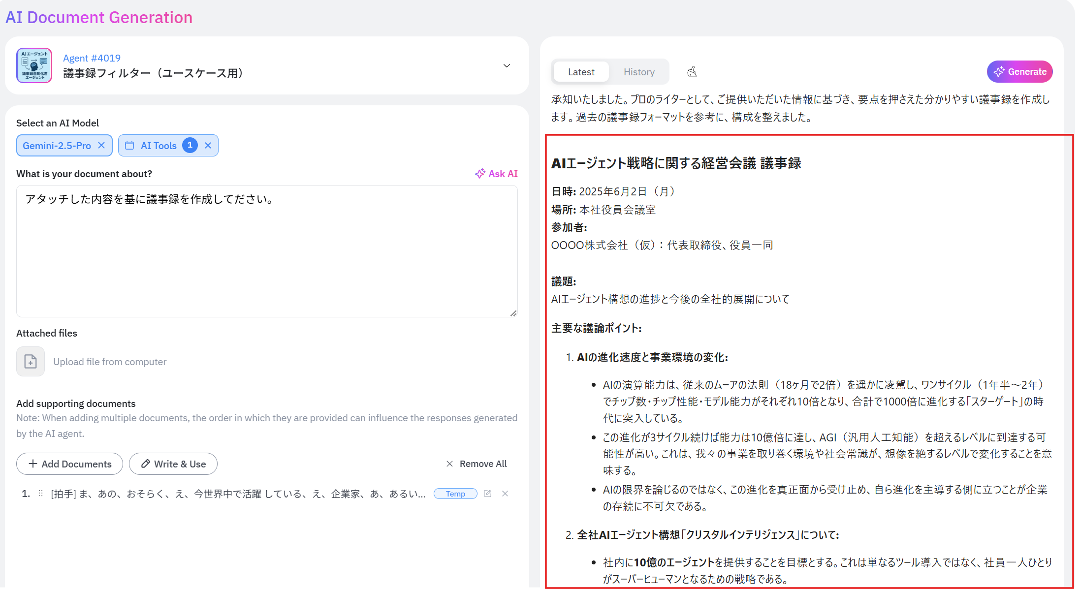 「生成」ボタンをクリックすると、AIエージェントがアタッチされた資料を読み込み、議事録の作成を開始します。 生成が完了すると、以下のように整理された議事録が出力されます。
