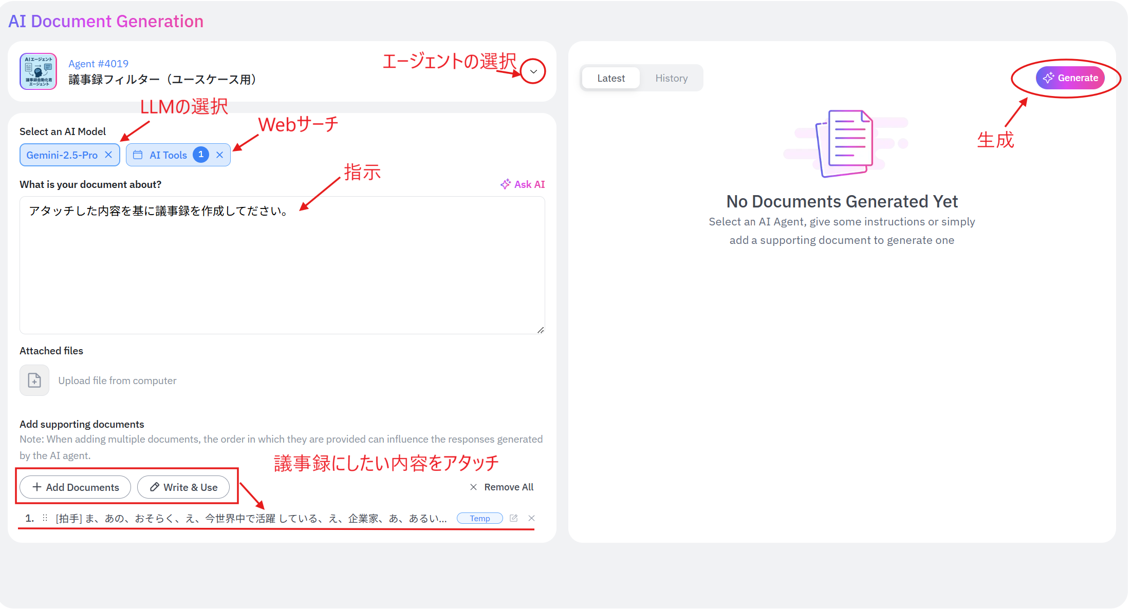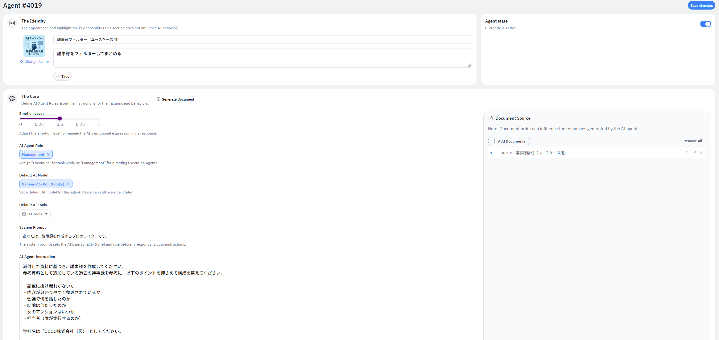 フォーマットの指定: エージェント設定画面の右側にある「+ Add Documents」に、議事録のテンプレート(フォーマット)となるファイルをあらかじめ登録しておくことができます。