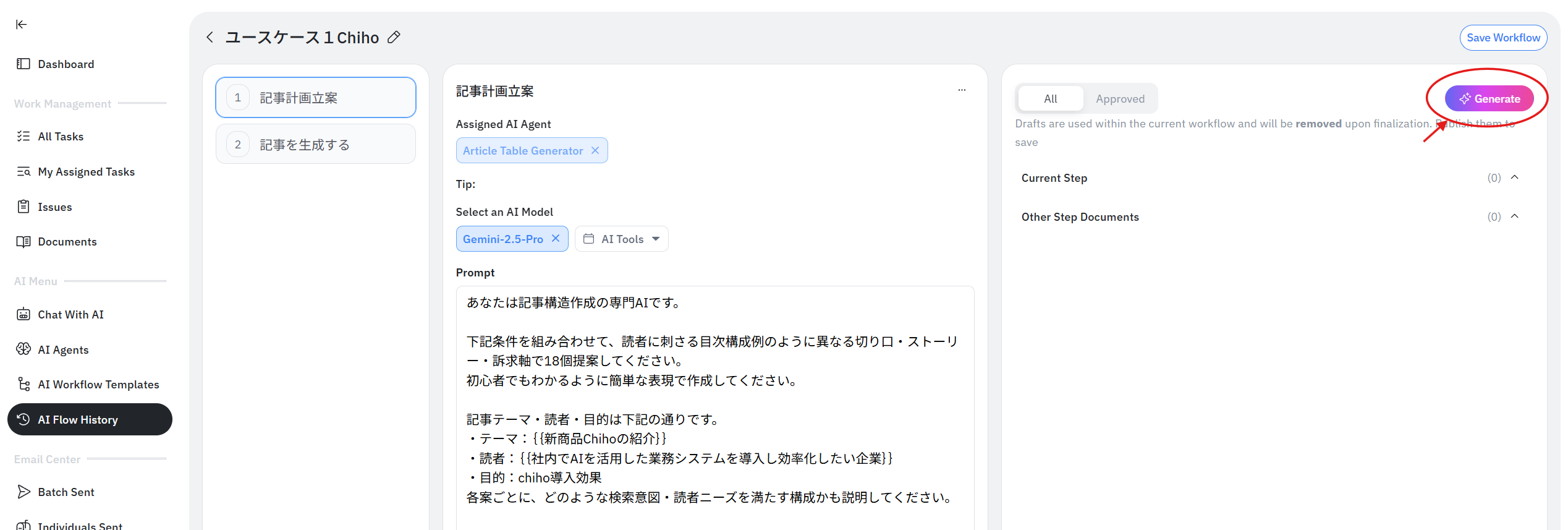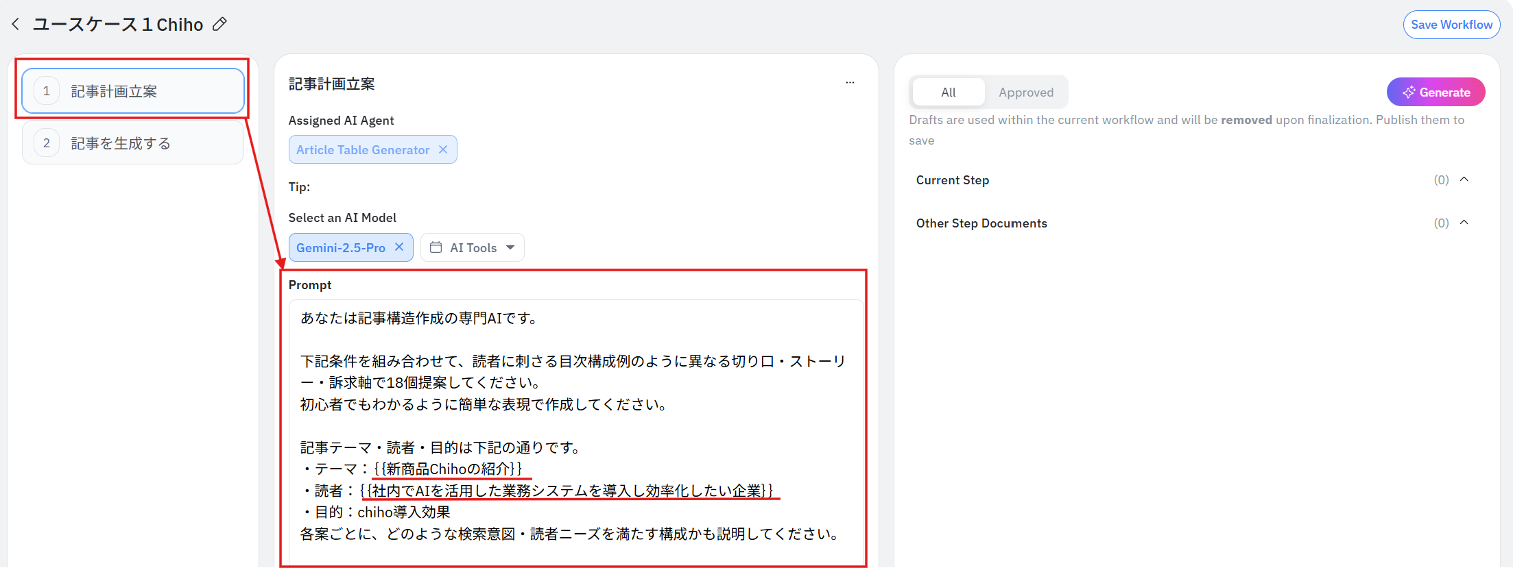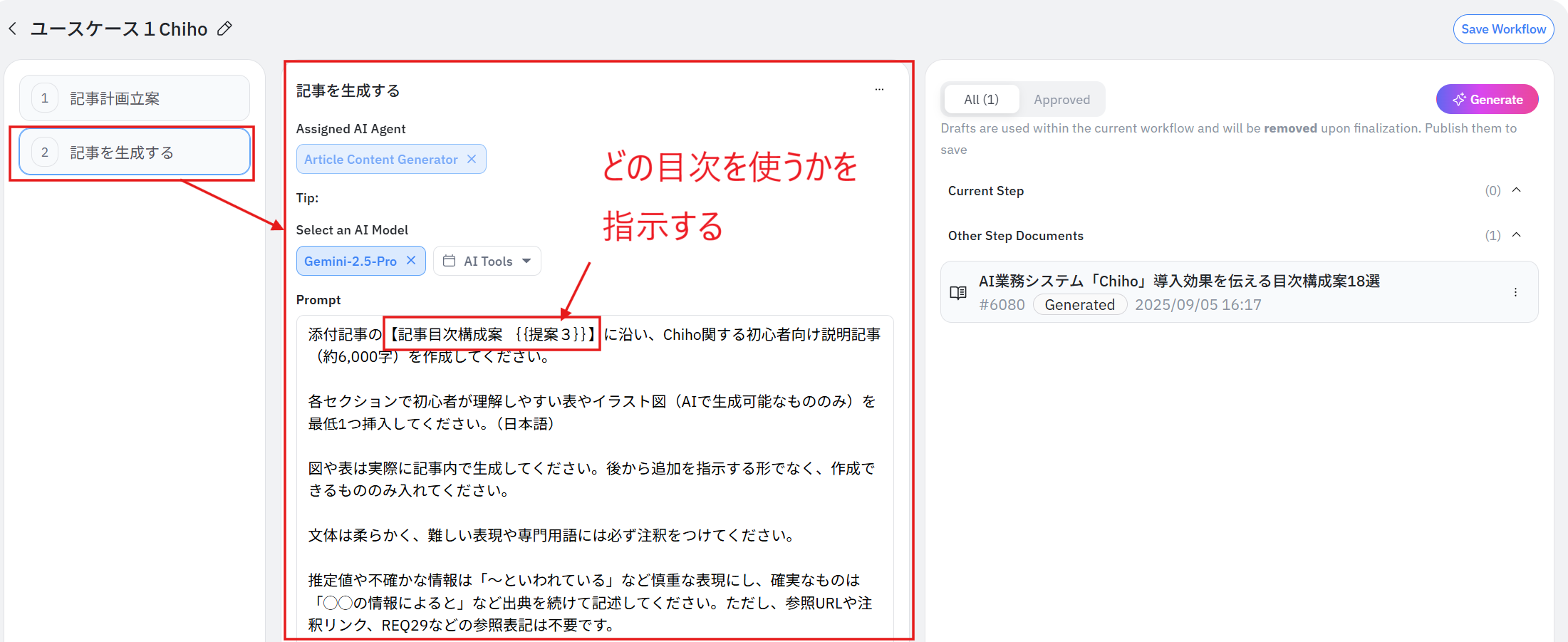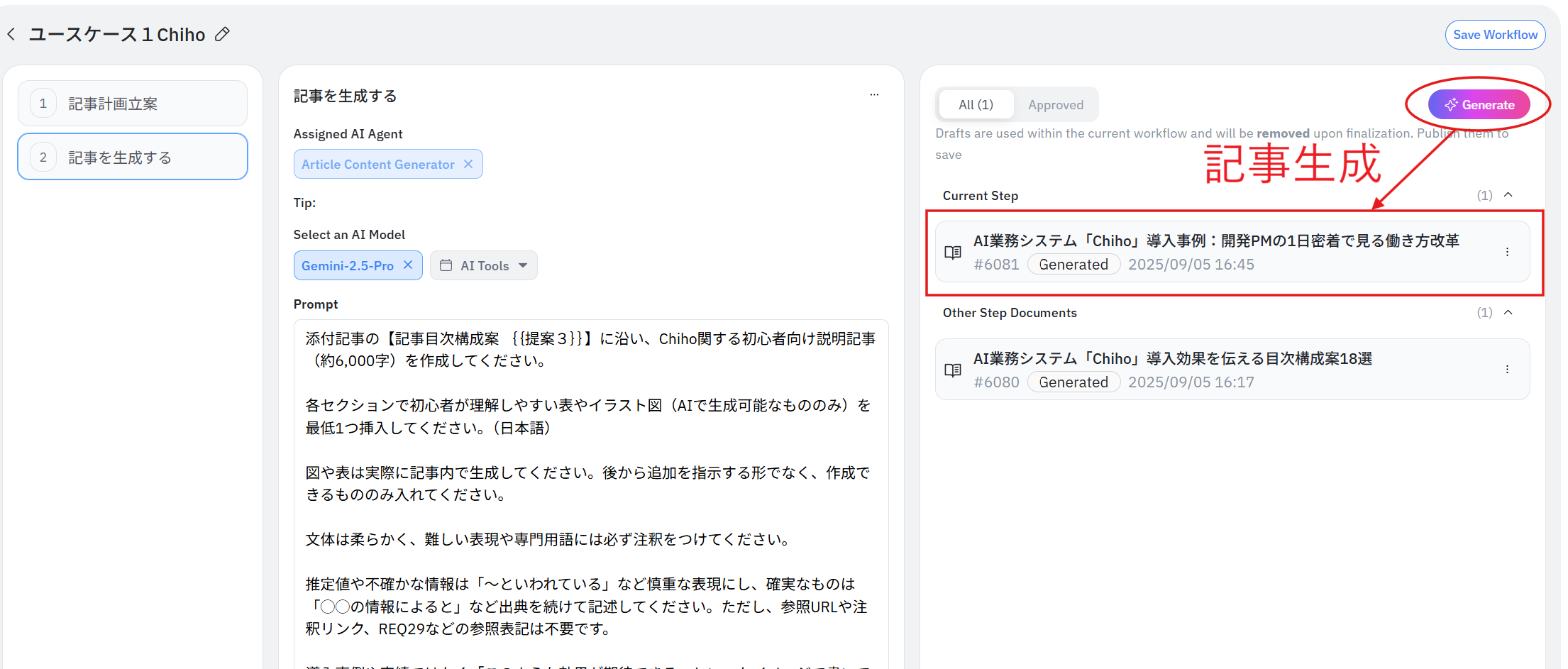 事前準備(後述)で作成したワークフローを使い、実際に記事を作成していきます。