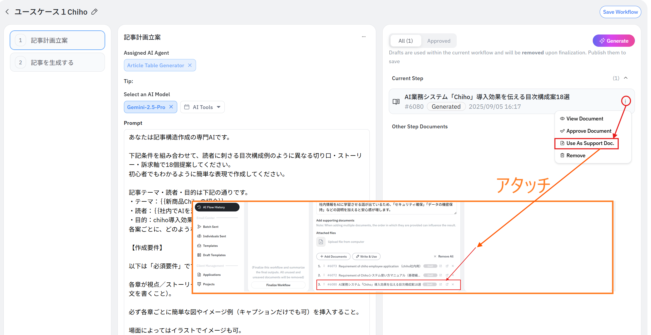 生成された目次案を次のステップに引き継ぐため、「・・・」メニューから 「Use as a supporting document」 を選択してアタッチします。これがAIへの「この資料を参考にしてね」という指示になります。