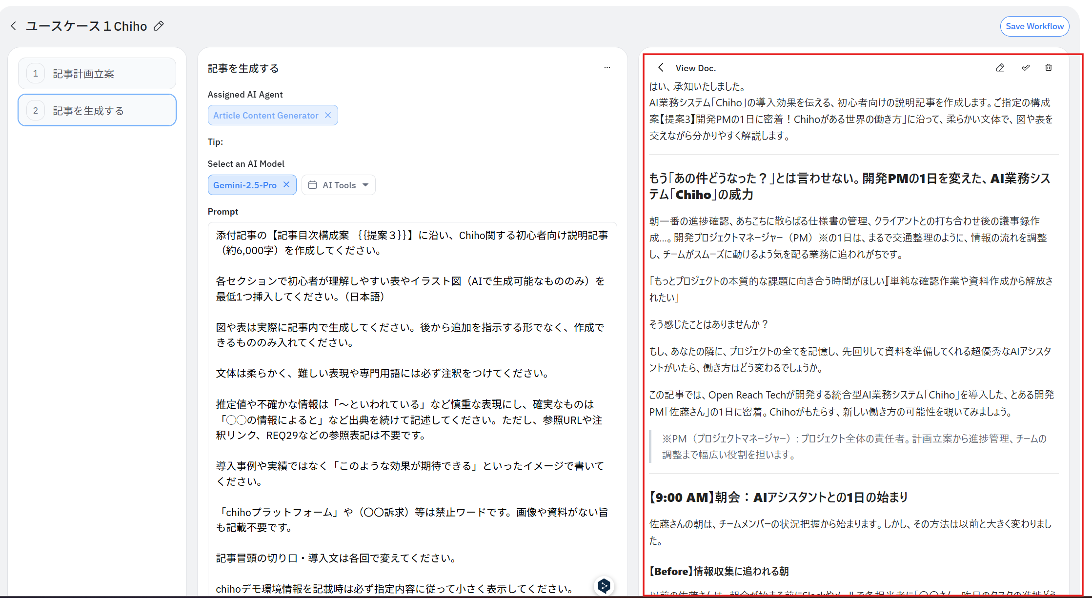 ChihoのAIワークフロー機能を使った「記事作成」のユースケースについて、初心者の方にも分かりやすく、具体的な手順を交えて詳しくご説明します。