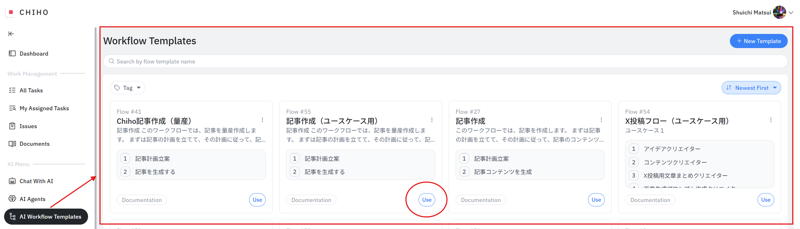 サイドメニュー「AI Workflow Templates」から、作成済みの「ブログ記事作成ワークフロー」を選択し、実行を開始します。