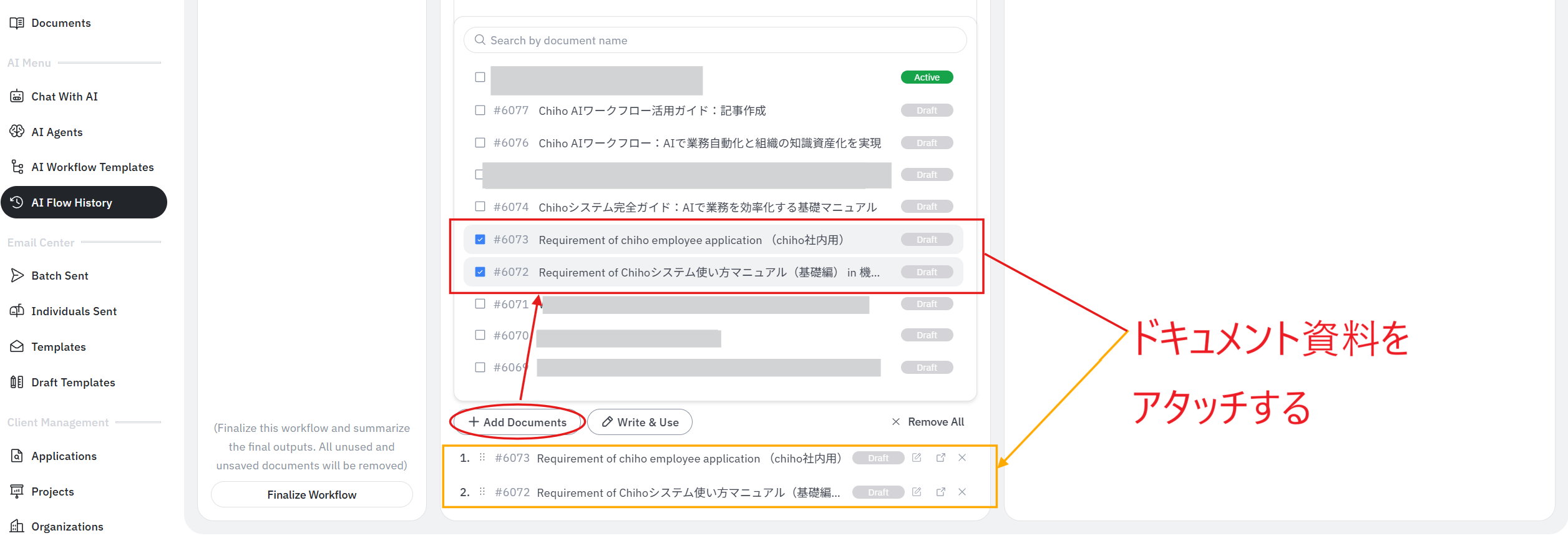 記事の元ネタとなる資料(製品仕様書など)を 「+Add Document」 からアタッチ(添付)します。